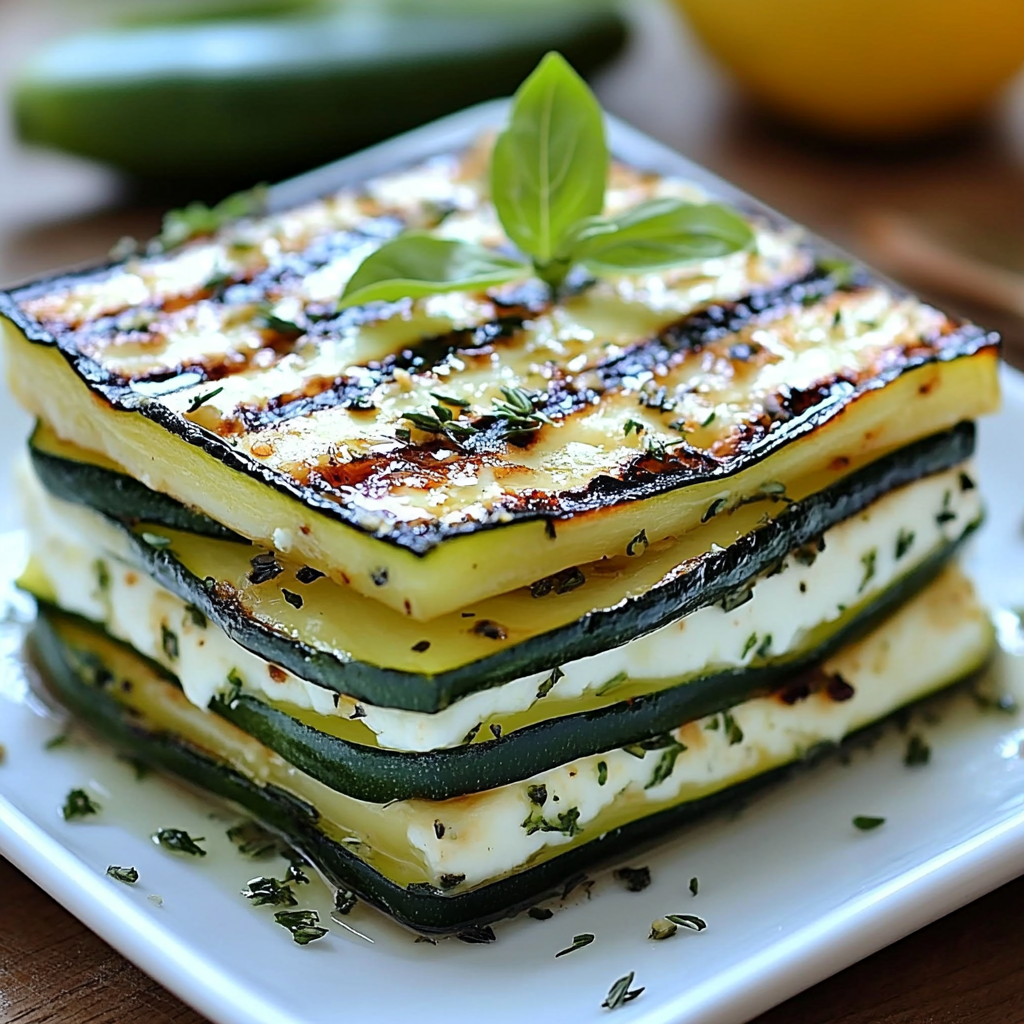 Millefeuille de Courgettes Grillées, Fromage Frais aux Herbes & Citron : Une entrée fraîche et élégante