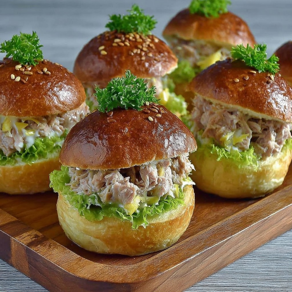 Les mini brioches refroidies sont découpées horizontalement, sans les séparer complètement. La garniture au thon est déposée généreusement à l’intérieur, en veillant à une répartition homogène.