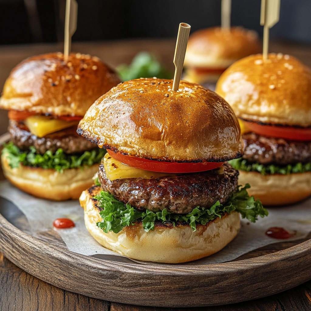 3. Service : Piquez chaque mini burger avec un cure-dent ou un pic en bois pour maintenir l’ensemble. Servez immédiatement, accompagné d’une petite salade ou de frites si désiré.