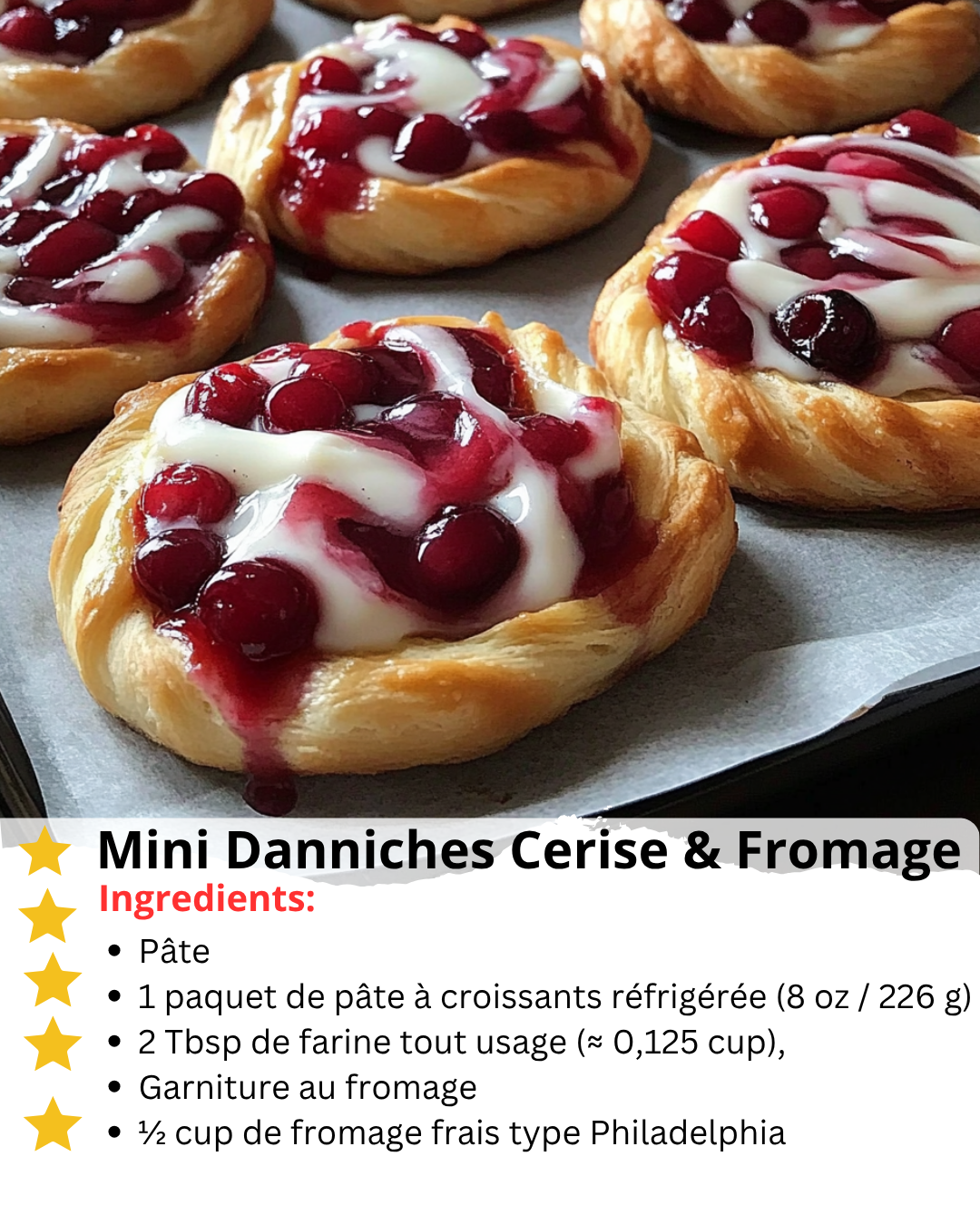 Ces Mini Danniches Cerise & Fromage illustrent à merveille comment une pâtisserie simple peut se transformer en une gourmandise élégante, tout en demandant un minimum de préparation. La recette propose un équilibre subtil entre le croustillant de la pâte feuilletée, le fondant de la crème au fromage et l’éclat acidulé des cerises.
