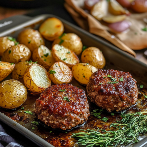 1. Faites cuire : Enfournez la plaque pendant 25 à 30 minutes, jusqu’à ce que les pommes de terre soient tendres et que les pains de viande atteignent une température interne de 160°F (70°C), vérifiée à l’aide d’un thermomètre de cuisson.