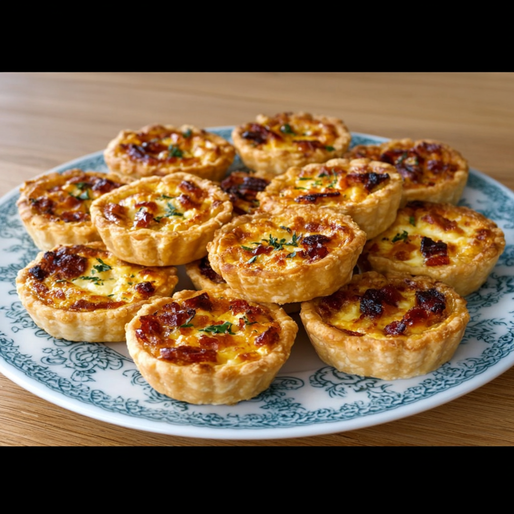 Avec leur pâte brisée croustillante, leur garniture fondante aux œufs et à la crème, et le goût délicatement fumé de la poitrine fumée, ces petites quiches séduisent immédiatement. Elles sont idéales pour un apéritif dinatoire, un brunch, un buffet de fête, un pique-nique ou même une entrée accompagnée d’une salade verte.