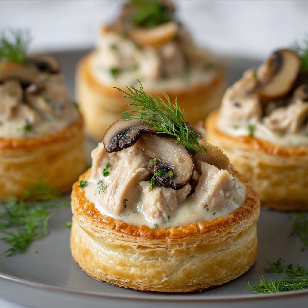 Ces mini vol-au-vent sont parfaits pour une entrée raffinée ou un buffet festif. On peut les disposer sur un grand plat de service ou les présenter individuellement sur des assiettes chaudes accompagnées d’une salade verte croquante. Pour un effet élégant, saupoudrer un peu de persil ou de ciboulette hachée sur le dessus et servir immédiatement.