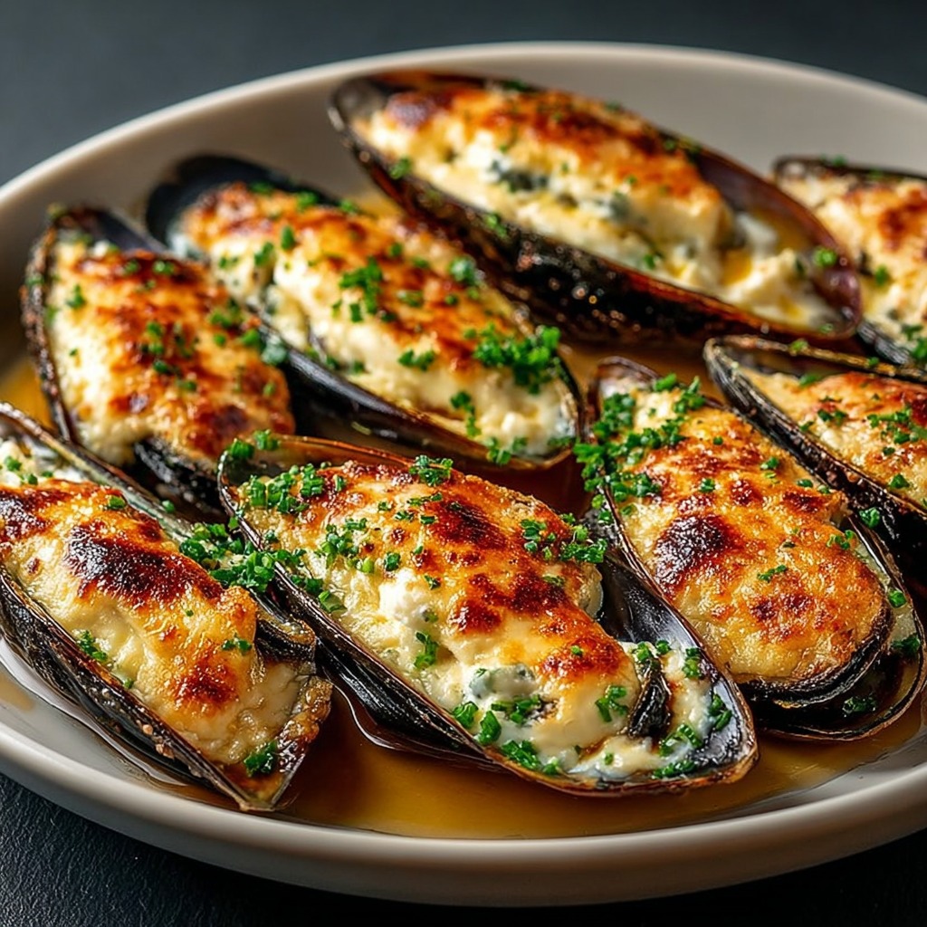 Les moules gratinées au chèvre frais et miel d’acacia illustrent une cuisine délicate et équilibrée, où chaque ingrédie