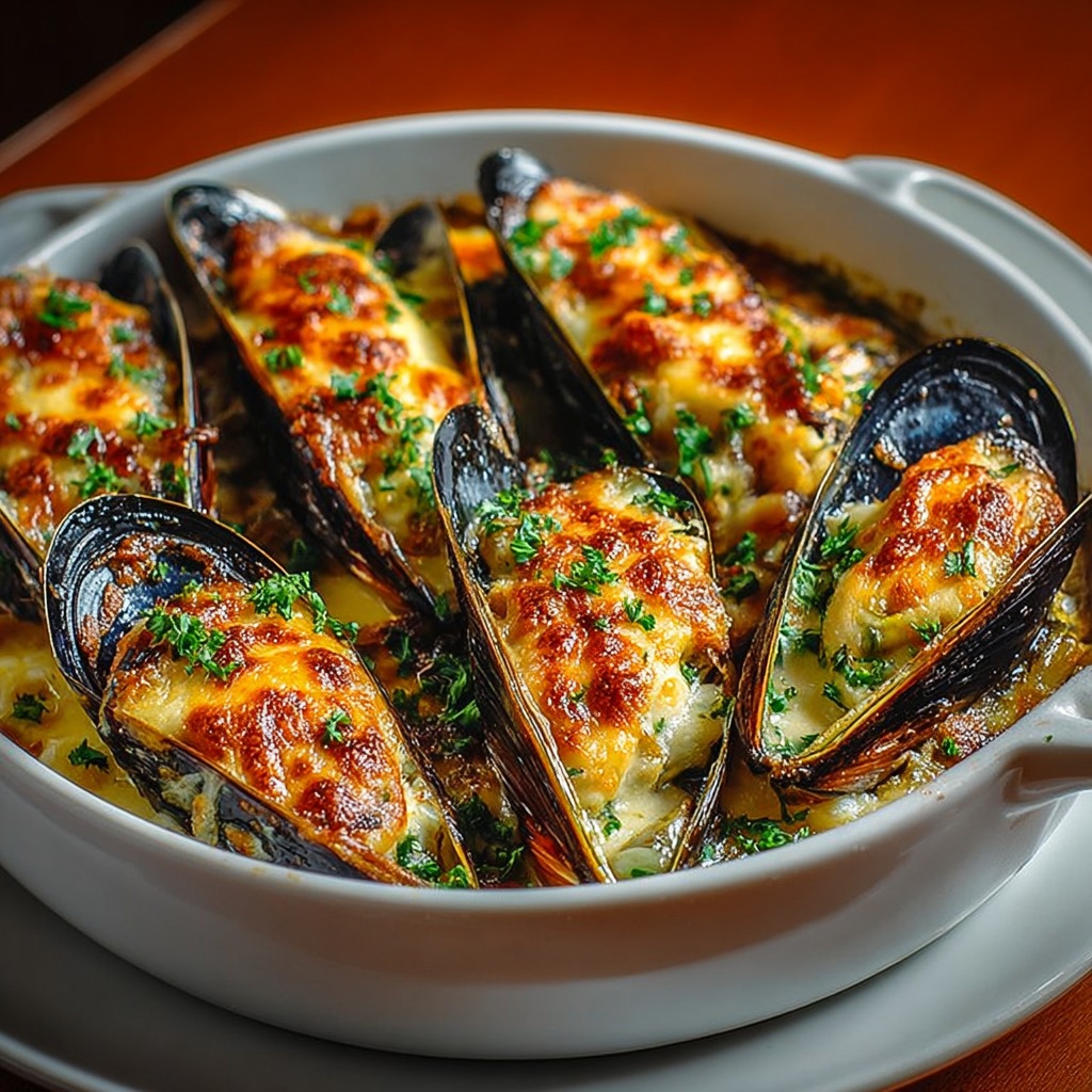 Les moules gratinées au pecorino et poireau confit constituent une entrée raffinée ou un plat léger qui associe la puissance du fromage italien à la douceur fondante du poireau. Cette recette met en valeur la moule sans masquer sa saveur iodée, grâce à un équilibre précis entre le salé du pecorino, l’onctuosité de la crème et la rondeur végétale du poireau lentement confit.