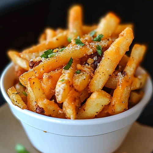 - Vous pouvez aussi garnir les frites d’un peu de coriandre hachée, de crème sure ou de salsa pour ajouter une touche fraîche et gourmande.
