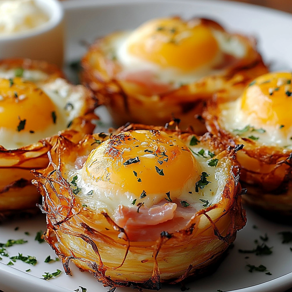 Les nids de pommes de terre, garnis d’œufs, de jambon et de fromage, sont une manière originale et savoureuse de revisiter les classiques du petit-déjeuner ou du brunch. Cette recette combine la douceur des pommes de terre, la richesse des œufs, la saveur du jambon et le fondant du fromage, le tout dans une présentation élégante.