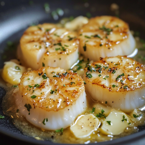 De savoureuses noix de Saint-Jacques dorées au beurre, relevées d’ail et de persil frais pour une explosion de saveurs délicates.