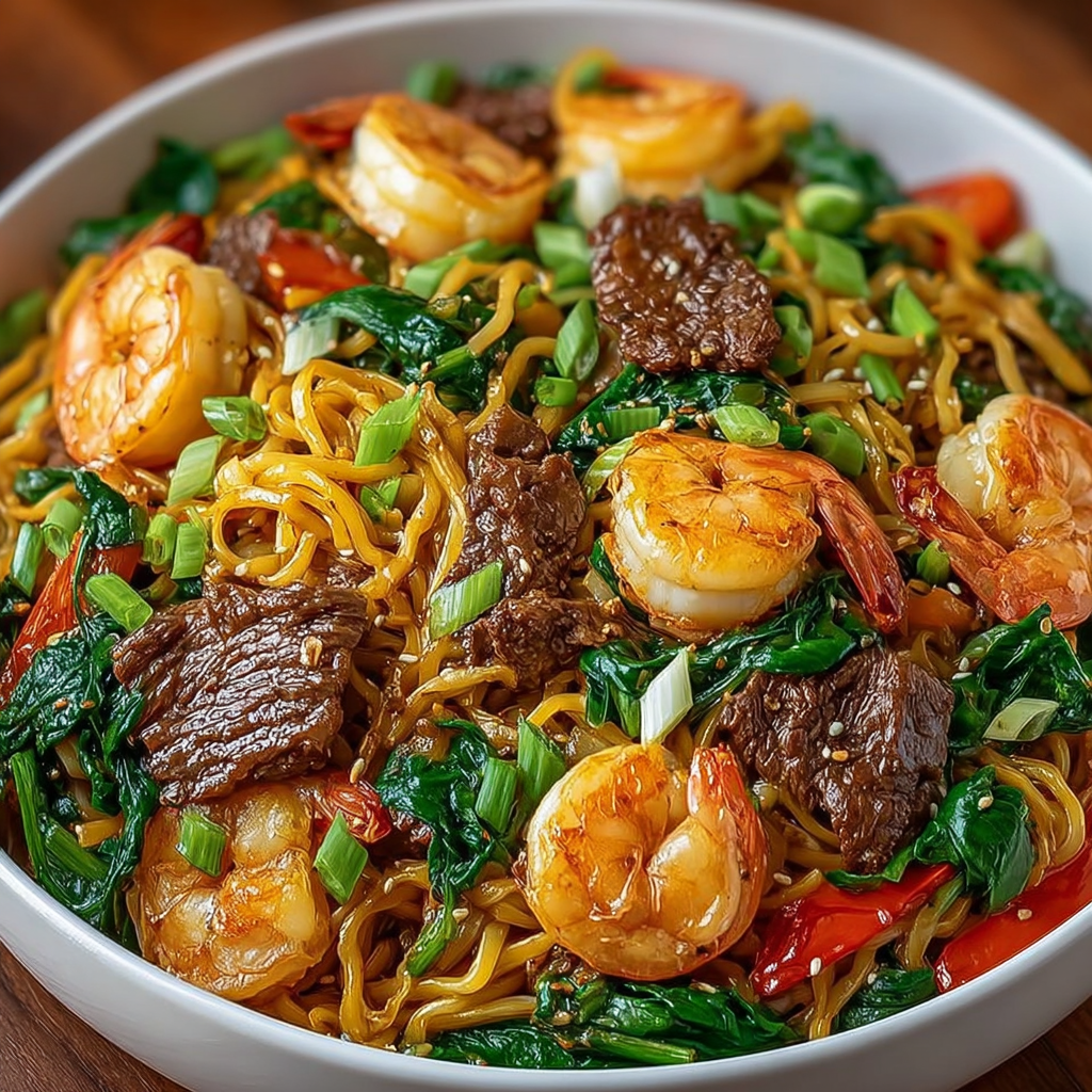 Un plat savoureux et rapide à préparer, où se mêlent tendreté du bœuf, douceur des crevettes et croquant des légumes, le tout relevé d’une sauce légèrement sucrée-salée. Parfait pour un dîner en semaine ou un repas gourmand en famille.
