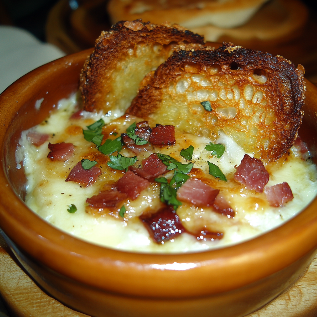 Les œufs cocotte en nid de pois cassés, lardons & tuile de comté sont une recette savoureuse, originale et réconfortante . Facile à réaliser, elle associe textures et arômes pour un résultat gourmand.