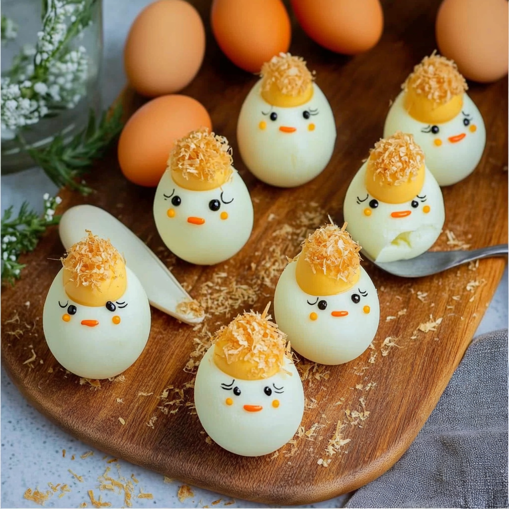 Ces œufs farcis, décorés en forme de poussins, apportent une touche ludique et gourmande à votre table de Pâques.