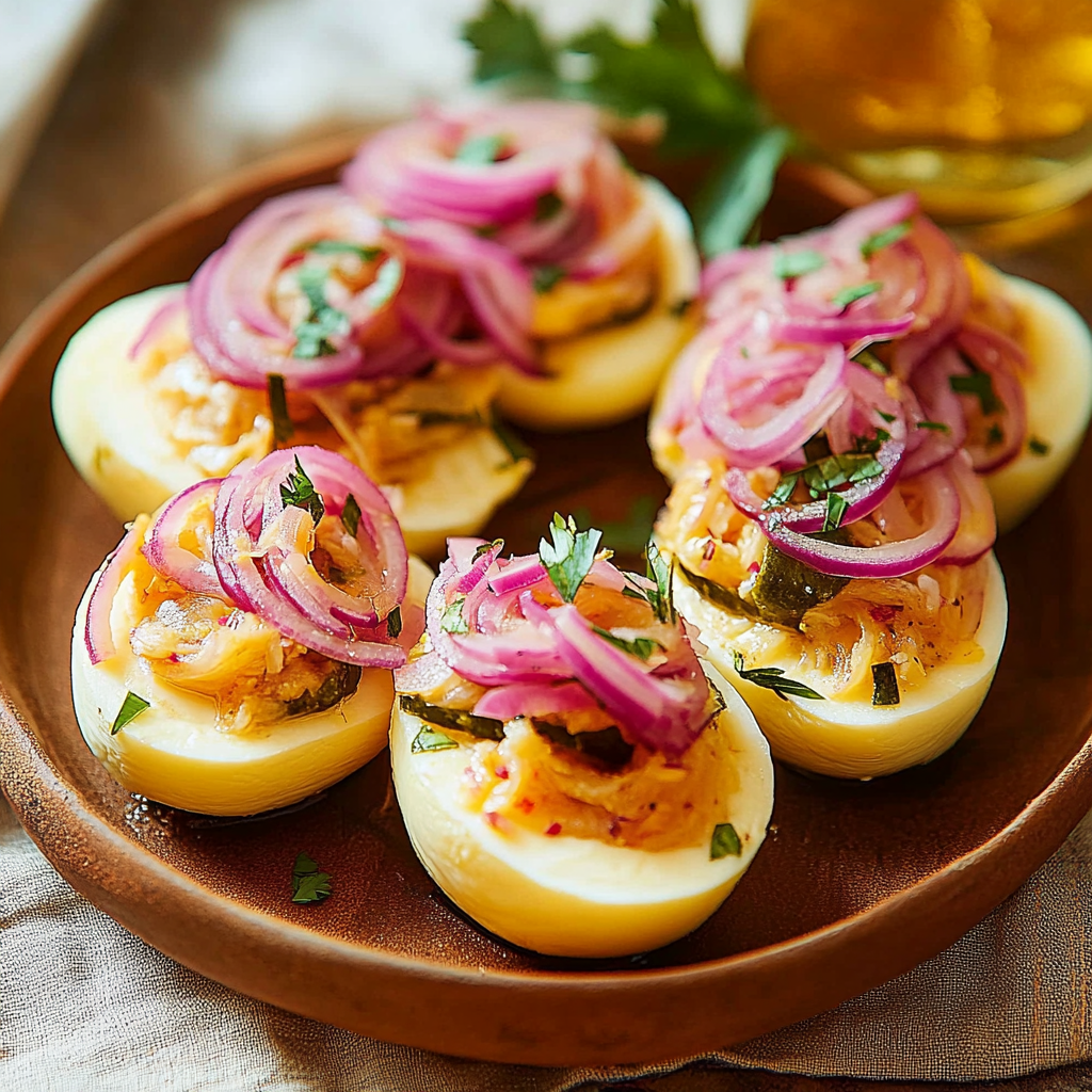 • Déposez un petit tas d’oignons rouges pickles sur chaque œuf farci pour ajouter une touche acidulée et croquante.