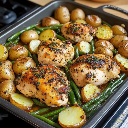 Placez le plat au four et laissez cuire pendant 40 à 45 minutes. Le poulet doit atteindre une température interne de 74°C (165°F), et les pommes de terre doivent être tendres et dorées. Si nécessaire, remuez les légumes à mi-cuisson pour garantir une cuisson uniforme.
