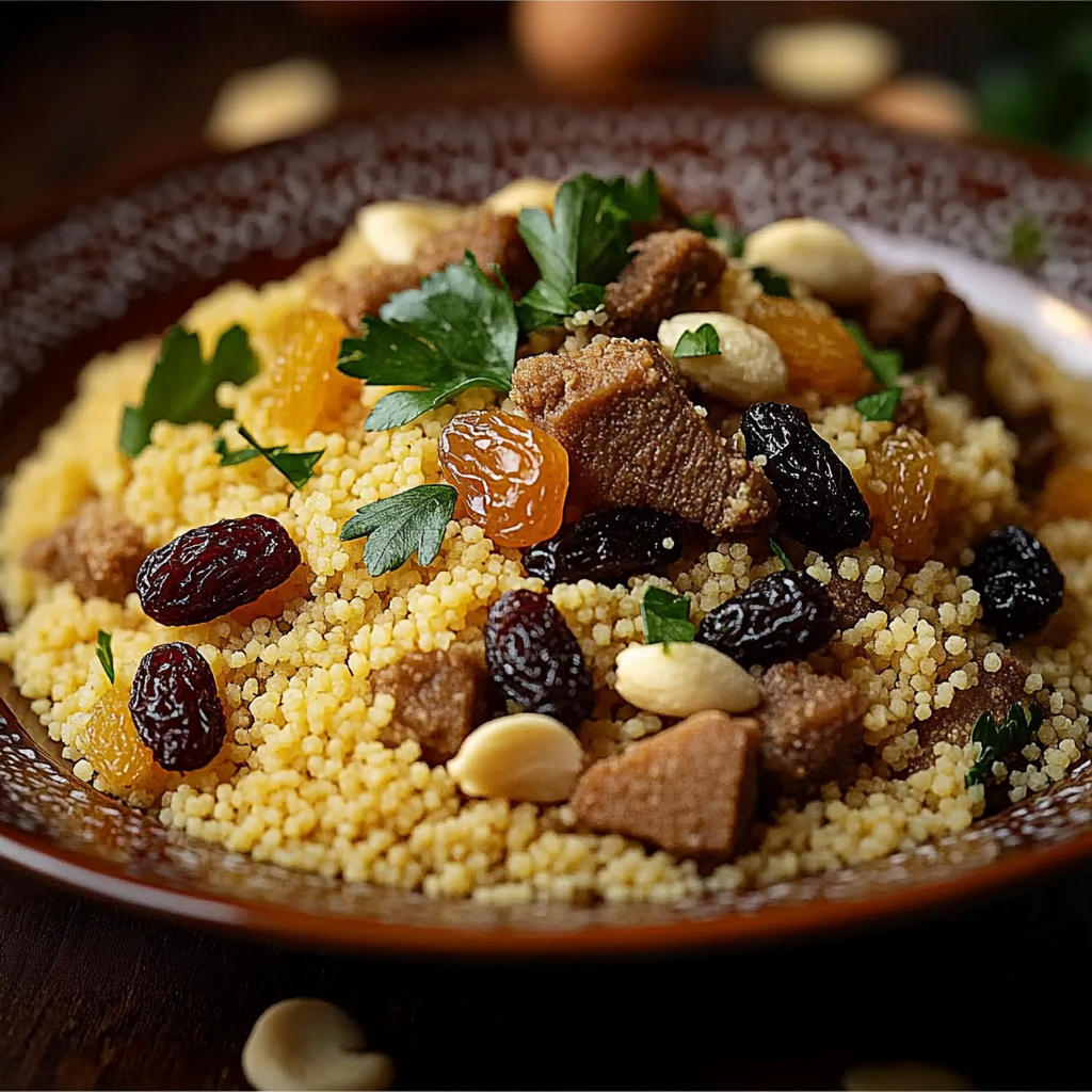 Le couscous est un pilier de la cuisine nord-africaine, notamment au Maroc, où il est préparé de diverses manières selon les régions et les occasions. Traditionnellement, il est servi lors des grandes fêtes, des mariages et des repas dominicaux en famille. Le couscous aux raisins secs et amandes, souvent appelé “Mesfouf” ou “Seffa”, est une version sucrée-salée qui combine la semoule légère avec des fruits secs et des épices, offrant un équilibre parfait de textures et de saveurs.