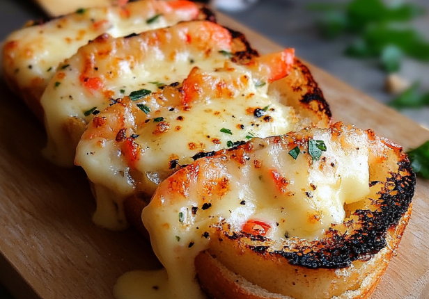 Un délicieux pain à l’ail garni de fromage fondant et de crevettes grillées. Parfait pour un repas simple mais gourmand, idéal pour les soirées entre amis ou un dîner élégant.