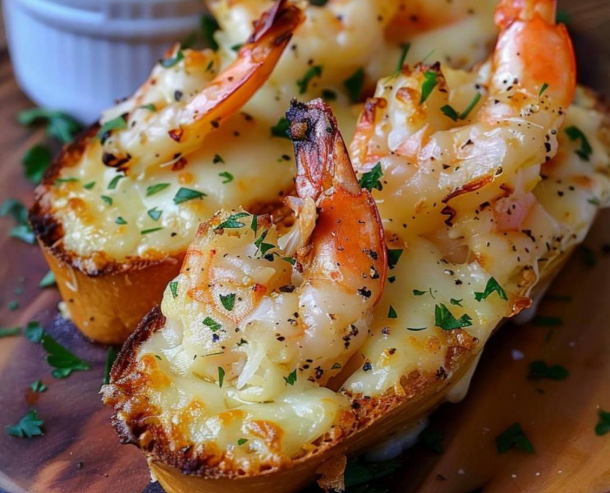 Végétarien : Si vous ne mangez pas de fruits de mer, vous pouvez remplacer les crevettes par des légumes grillés (comme des aubergines ou des courgettes), tout en conservant le reste de la préparation de pain à l’ail et du fromage.