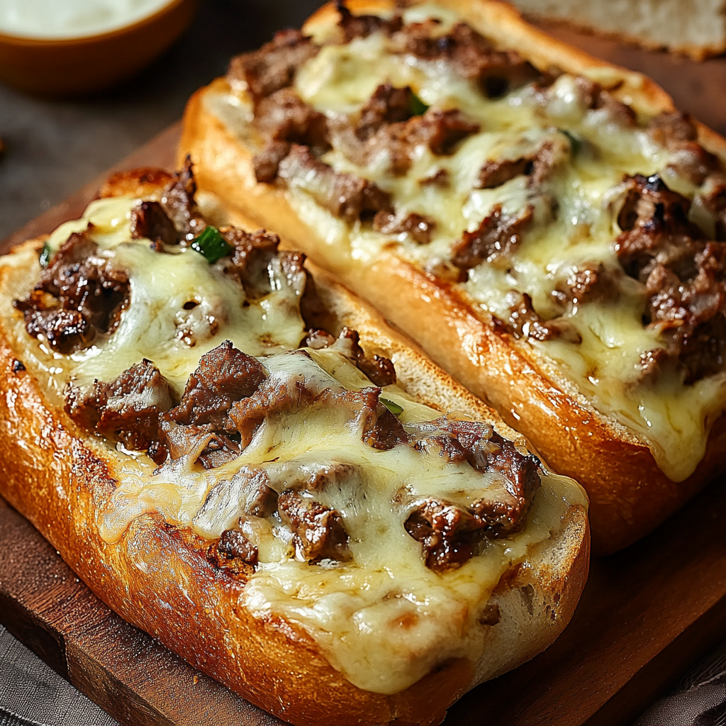 Un pain croustillant garni de steak au fromage savoureux, poivrons, oignons et champignons fondants. Parfait pour un repas rapide et délicieux !