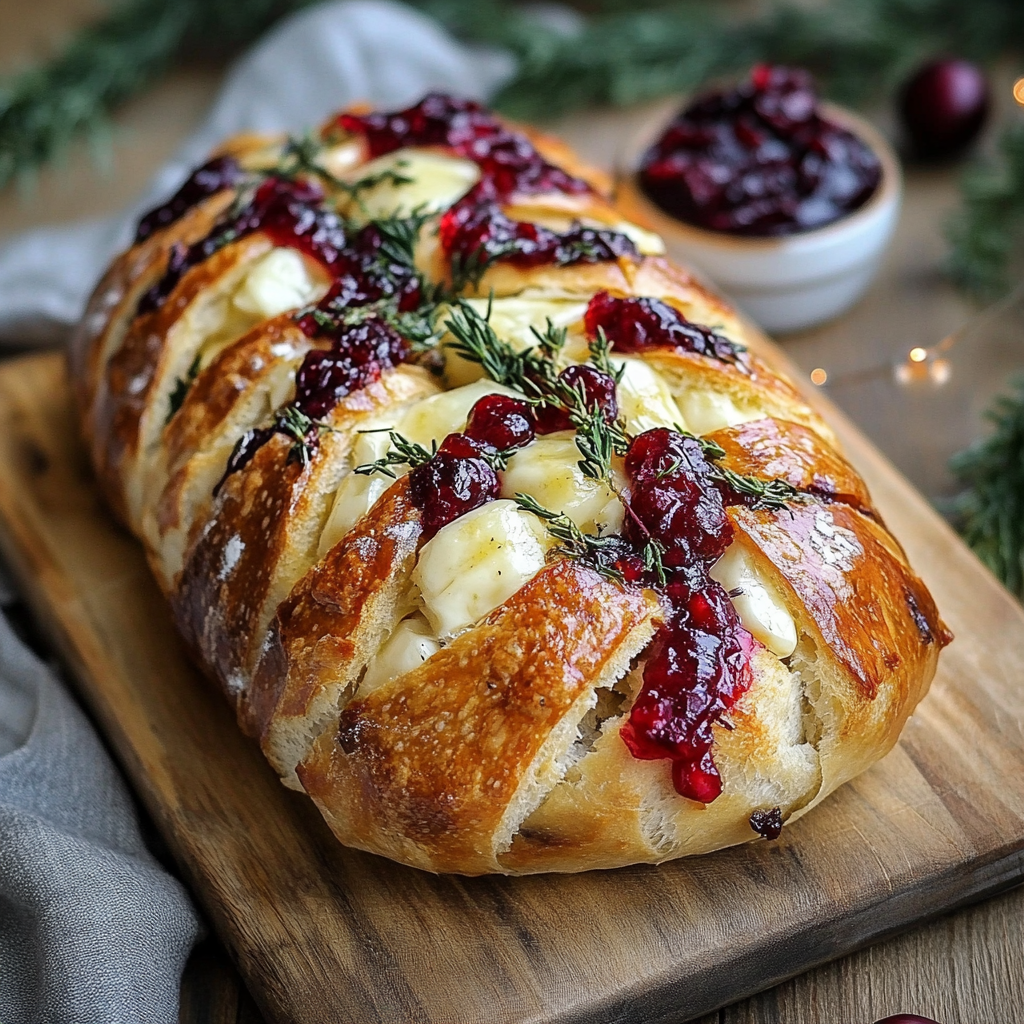 Un pain de campagne à l’ail, farci de brie fondant et de sauce aux canneberges, parfait pour les fêtes.