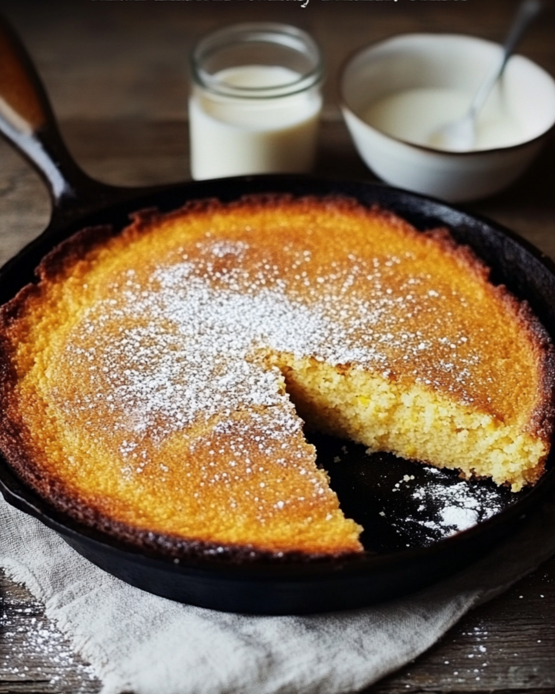 - Cuisson : Versez la pâte dans la poêle chaude (ou un moule légèrement graissé si vous n’utilisez pas de poêle en fonte). Enfournez et faites cuire pendant 20 à 25 minutes, ou jusqu’à ce qu’un cure-dent inséré au centre en ressorte propre.