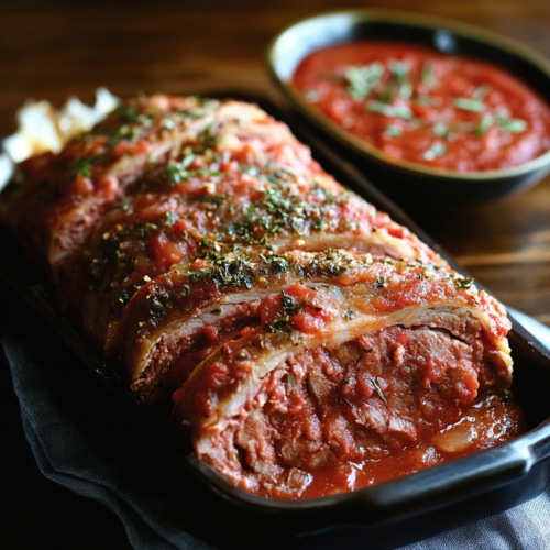Une fois cuit, sortez le pain de viande du four et laissez-le reposer pendant environ 10 minutes avant de le couper en tranches. Cela permet aux jus de se répartir uniformément et rend le pain de viande encore plus juteux et savoureux. Servez-le directement dans le plat de cuisson pour garder son côté chaleureux et réconfortant. Vous pouvez l’accompagner d’une purée de pommes de terre crémeuse, de légumes vapeur, ou d’une simple salade verte.