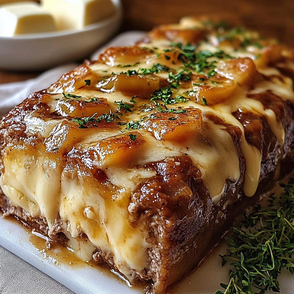 Sers ton pain de viande à l’oignon dans des tranches épaisses avec le fromage fondant sur le dessus, et n’oublie pas une bonne cuillère de sauce provenant des oignons caramélisés pour napper le tout.