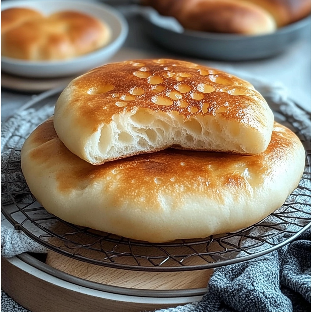 • Finition : Une fois cuits, retirez les pains de la poêle et laissez-les refroidir légèrement sur une grille. Cela évitera qu’ils deviennent trop mous. Servez-les chauds, accompagnés de vos garnitures préférées, telles que du beurre, du fromage, ou même des confitures.