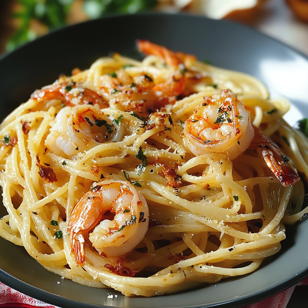 - Décorer : Servez la pasta aux crevettes chaude, garnie d’herbes fraîches hachées et, si désiré, d’un filet de jus de citron pour apporter une touche de fraîcheur.
