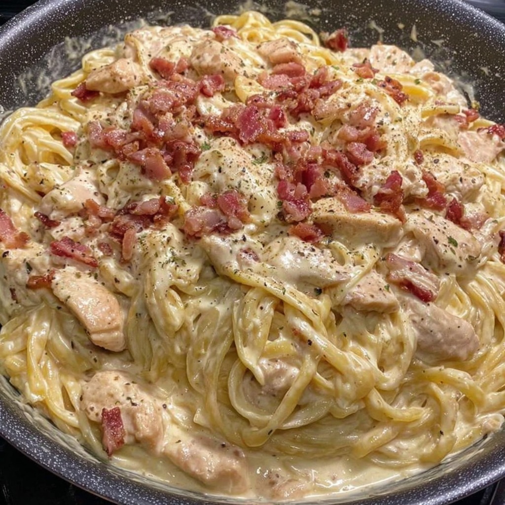 Les pâtes à la carbonara au poulet sont un plat copieux et réconfortant qui revisite avec gourmandise la carbonara italienne traditionnelle. Cette version marie des pâtes parfaitement cuites à des morceaux de poulet tendre, le tout nappé d’une sauce riche et crémeuse à base d’œufs, de fromage et d’ail. C’est un repas idéal pour les soirs de semaine chargés ou pour impressionner sans trop d’effort.