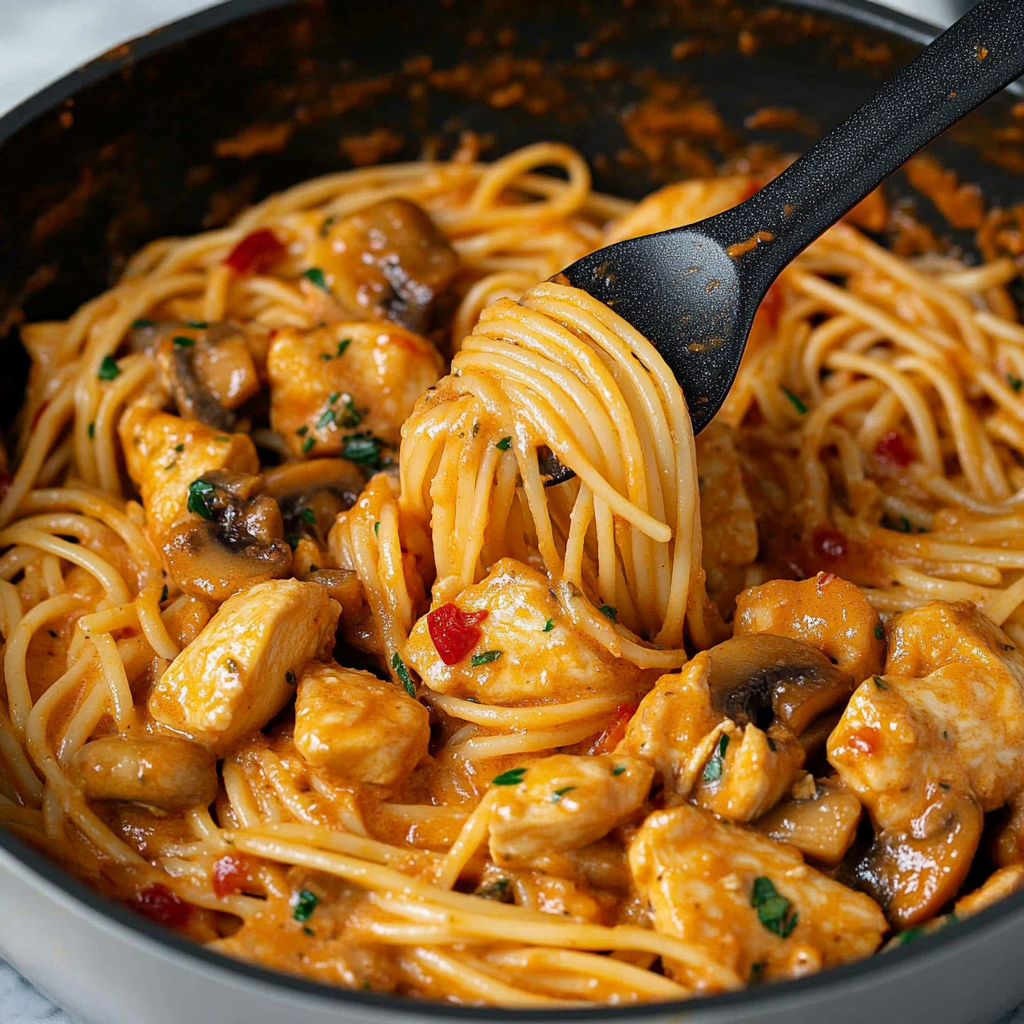 Ce plat marie la tendresse du poulet, le parfum terreux des champignons et la chaleur des épices dans une sauce crémeuse qui enrobe parfaitement les pâtes. Idéal pour un dîner réconfortant avec une petite touche relevée.