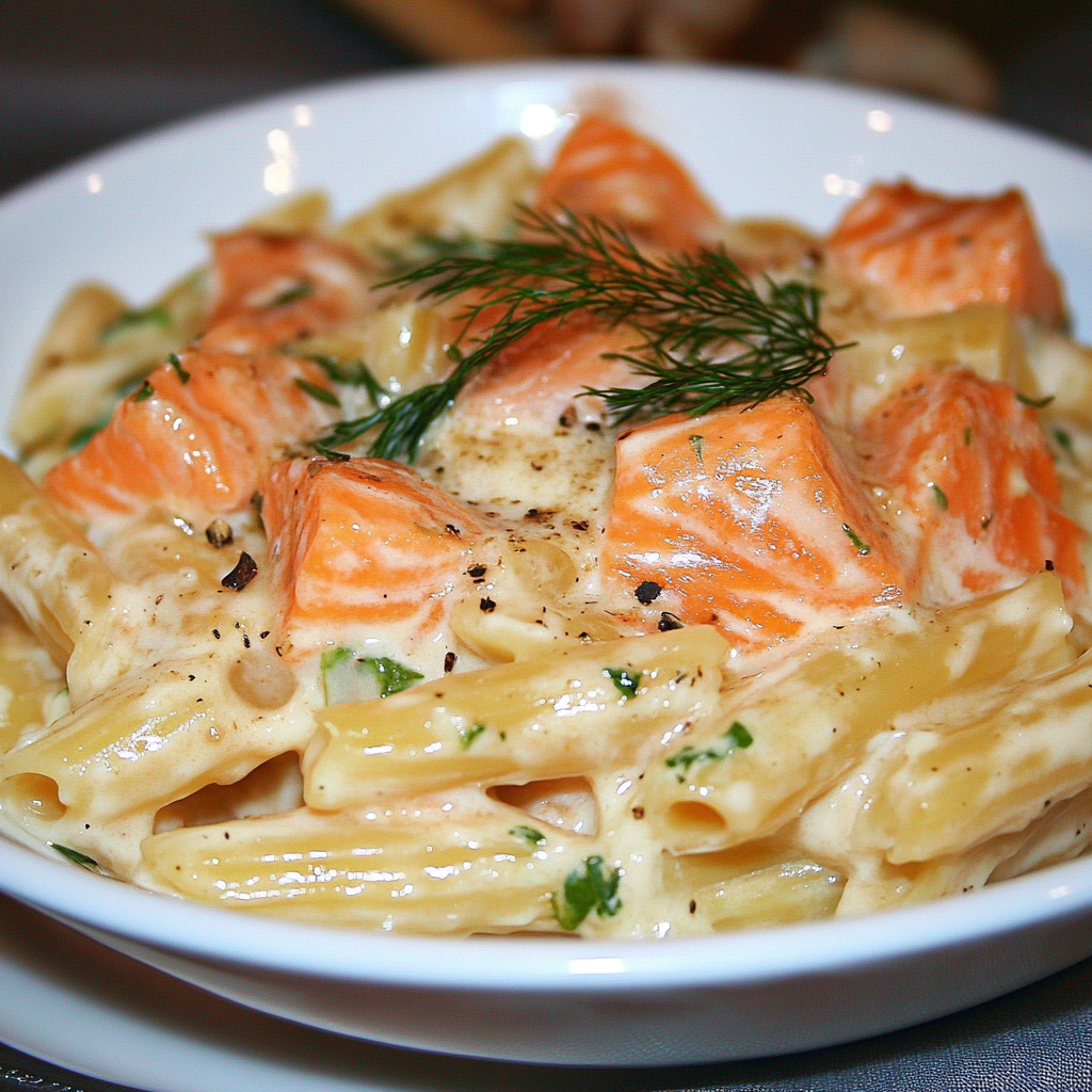 Savourez un délicieux plat de pâtes alliant saumon frais et saumon fumé, relevé d’une sauce crémeuse et parfumée à l’aneth.