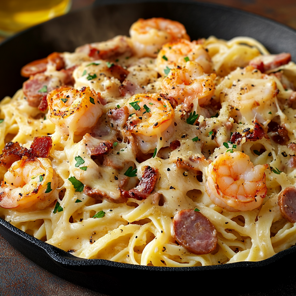 Les pâtes crémeuses au fromage, crevettes, saucisse et bacon sont un véritable régal pour les papilles. Ce plat combine la richesse de la crème et du fromage avec des protéines savoureuses, le tout rehaussé de l’umami des crevettes et du goût fumé de la saucisse. Que vous cherchiez un dîner rapide en semaine ou un plat réconfortant pour le week-end, cette recette est parfaite pour toutes les occasions.