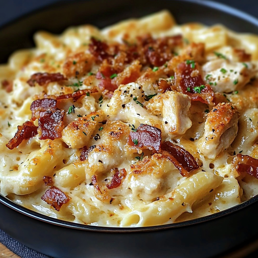Pour une belle présentation, servez ces pâtes crémeuses au poulet et au bacon dans des assiettes chaudes, et garnissez de persil frais. Une touche de poivre noir fraîchement moulu juste avant de servir ajoute une belle finition. Ce plat s’accompagne bien d’une salade verte pour équilibrer la richesse des pâtes.