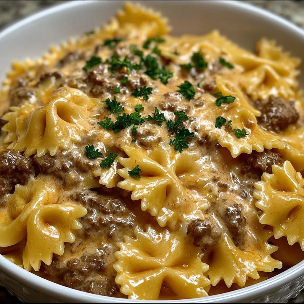 | Nom de la recette | Pâtes papillon à la viande hachée et sauce crémeuse |