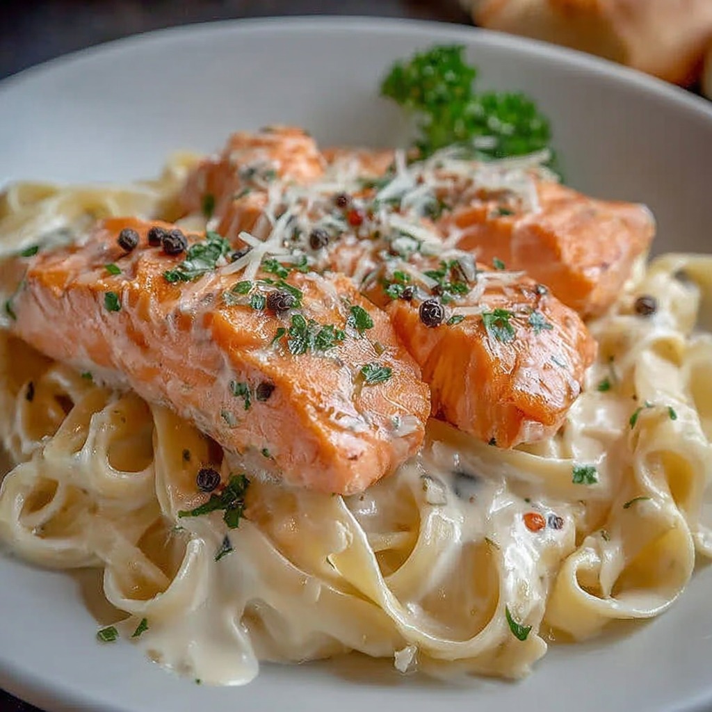 Le plat est servi chaud immédiatement après préparation. Il peut être présenté simplement dans une assiette creuse ou un plat de service. Un peu de fromage râpé peut être ajouté selon les préférences pour renforcer la gourmandise. Une présentation sobre met en valeur la couleur rosée du saumon et la crème.