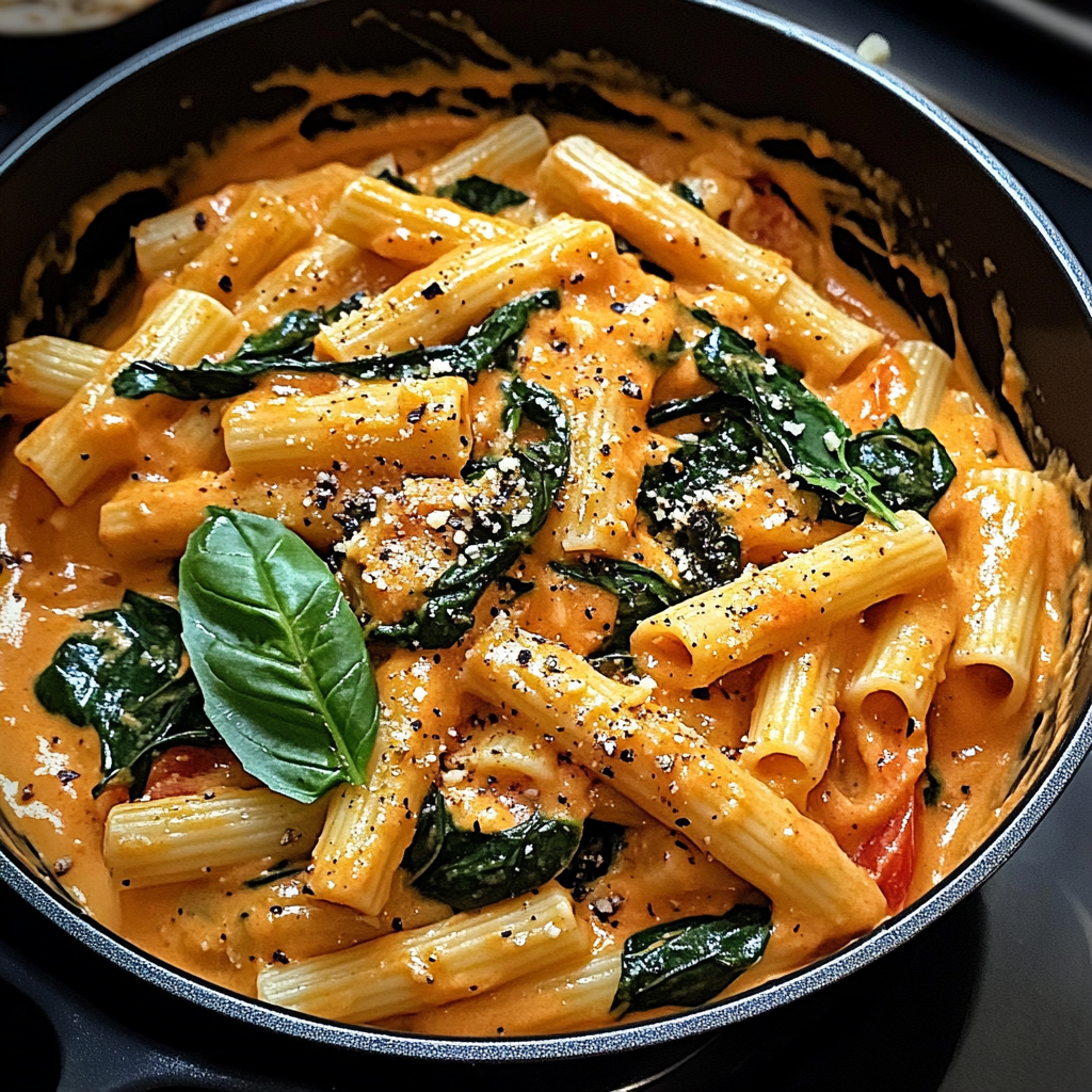 - Mélanger avec les pâtes : Incorporez les rigatoni cuits dans la sauce, en veillant à ce que chaque pâte soit bien enrobée. Ajoutez les épinards frais et laissez-les flétrir dans la chaleur de la sauce pendant 1 à 2 minutes.