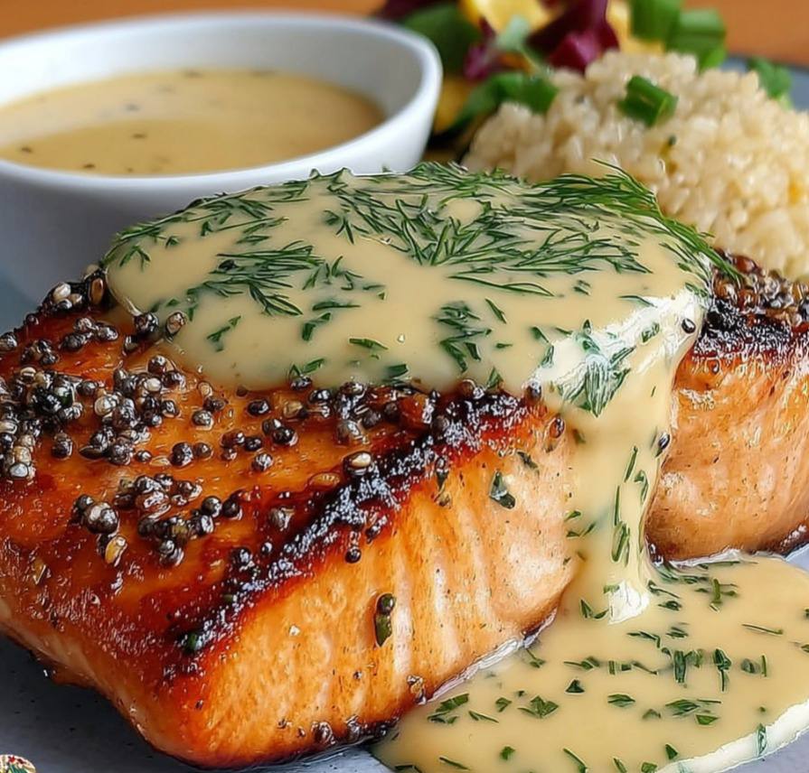 Le pavé de saumon à la sauce moutarde et aneth illustre l’équilibre parfait entre la richesse aromatique de la sauce et la délicatesse du poisson. La moutarde apporte du caractère et de la profondeur, la crème apporte douceur et onctuosité, tandis que l’aneth et le citron offrent fraîcheur et légèreté. Chaque bouchée combine tendreté, parfum et équilibre gustatif, garantissant un plat raffiné et élégant, idéal pour un dîner familial ou une occasion spéciale.