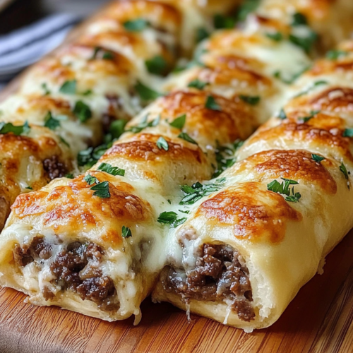 Les Philly Cheesesteak Stuffed Cheesy Breadsticks sont une délicieuse combinaison de pain moelleux, de viande tendre et de fromage fondant. Ces baguettes farcies au Philly Cheesesteak sont idéales pour un repas rapide, un apéritif entre amis ou un dîner en famille. Elles marient à merveille la douceur du fromage fondu avec la richesse du steak et l’arôme délicat de l’ail, pour un résultat irrésistible à chaque bouchée.