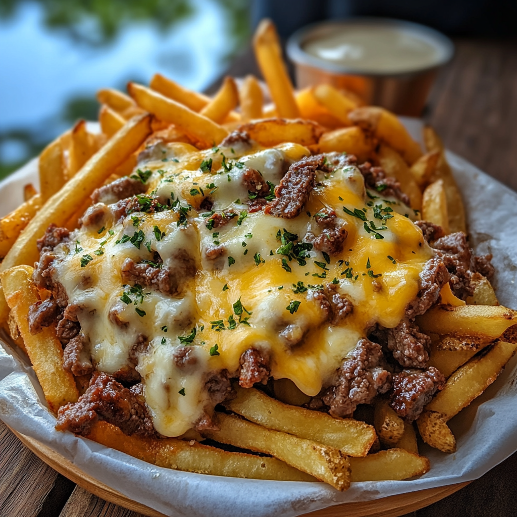 Savourez des frites croustillantes, garnies de steak juteux, de fromage fondu, et de légumes savoureux !