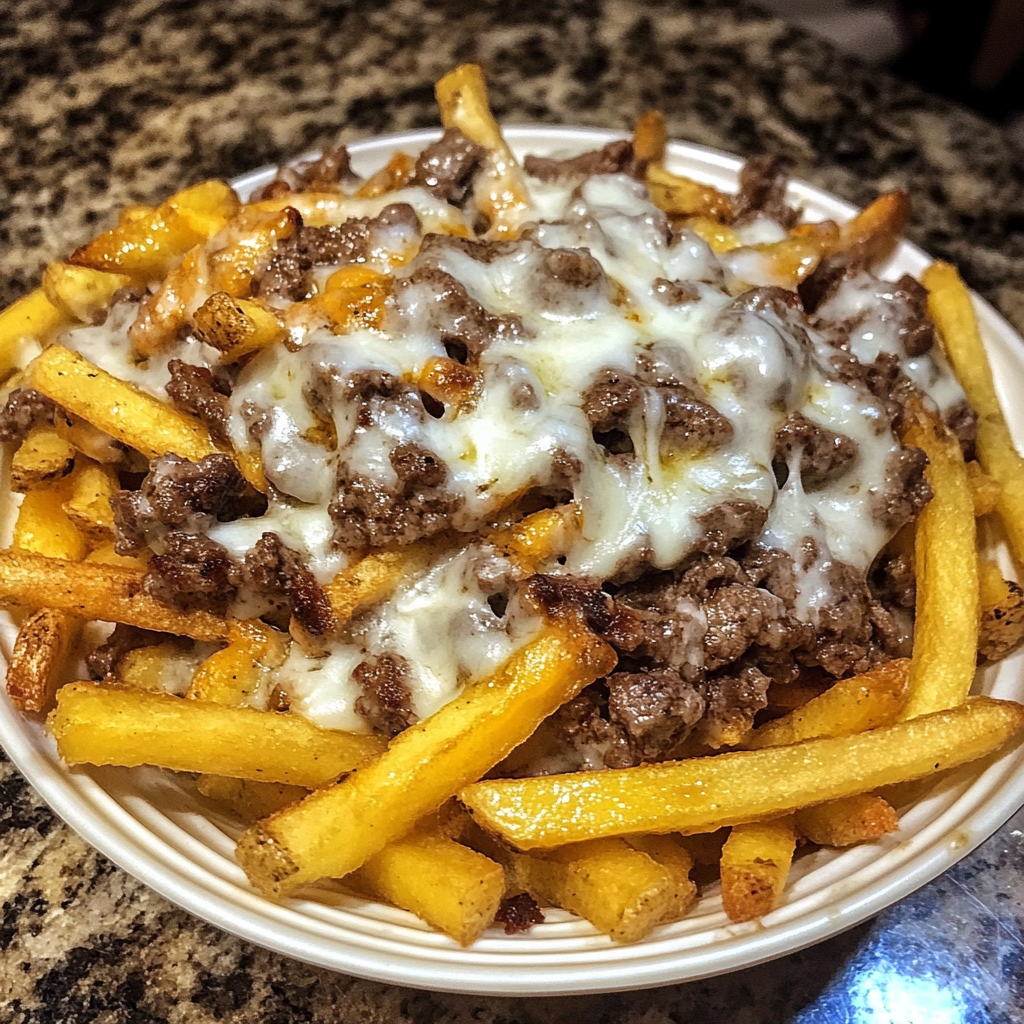 Transformez vos frites en un plat irrésistible avec du steak, des poivrons et du fromage!