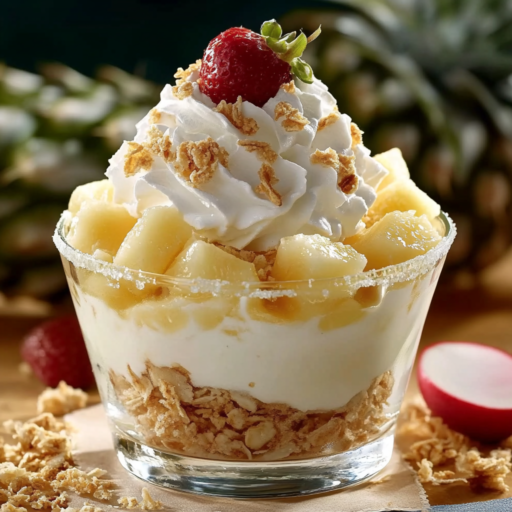 Si vous cherchez un dessert frais, tropical et qui fond dans la bouche, le Pina Colada Lush est exactement ce qu’il vous faut ! Ce dessert combine le goût doux et sucré de l’ananas avec la richesse de la noix de coco, le tout rehaussé d’une touche crémeuse et légère de garniture fouettée. Il est parfait pour les journées chaudes d’été ou comme gâterie lors de vos repas festifs.