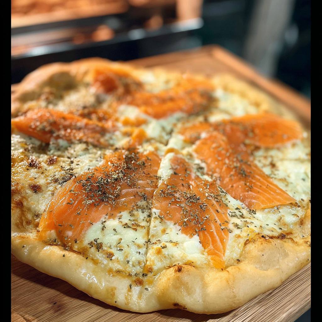 Ces ingrédients permettent de préparer une pizza simple mais raffinée, où le saumon fumé reste au centre des saveurs, accompagné d’une sauce crémeuse légère et d’une pâte croustillante.