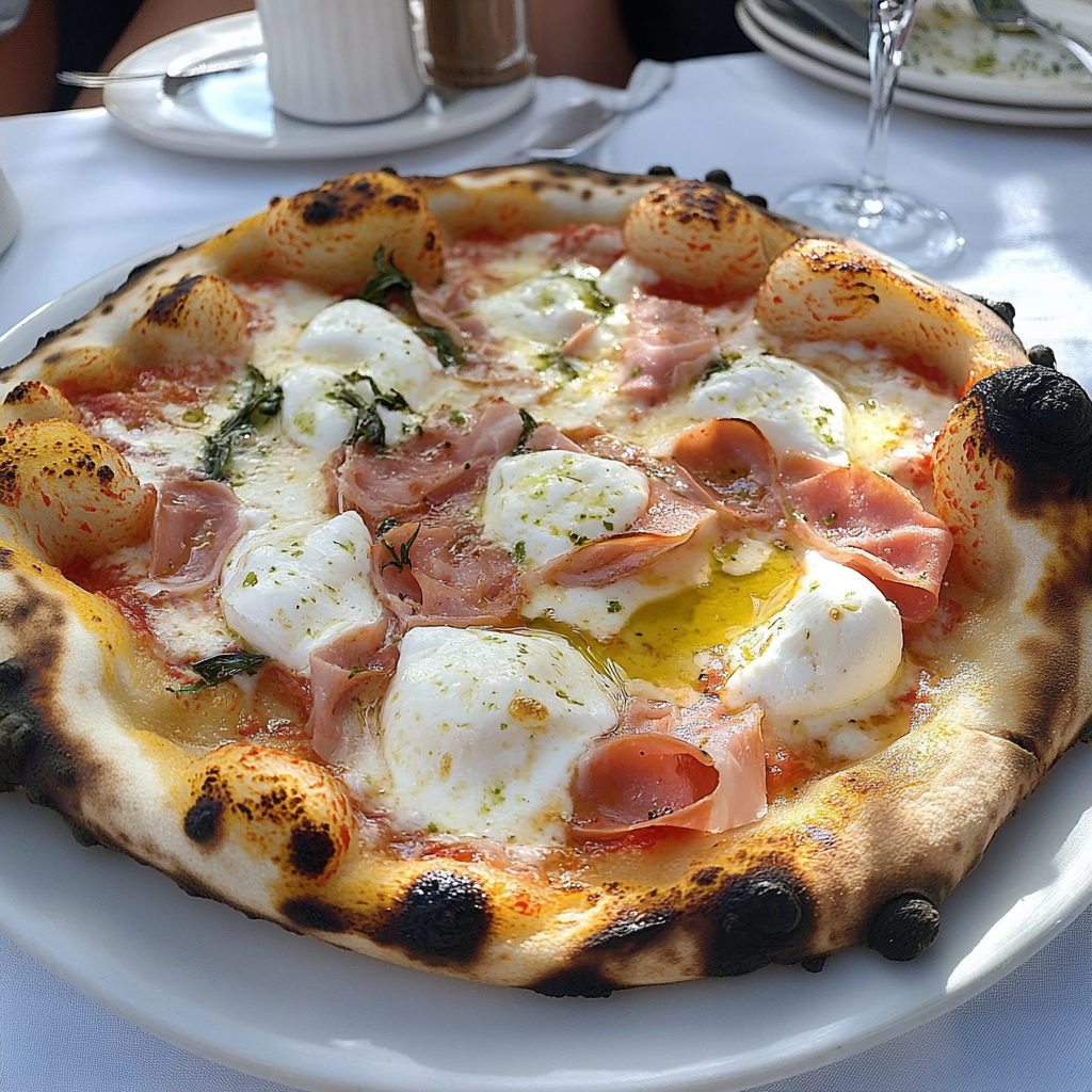 La pizza napolitaine, véritable symbole de la cuisine italienne, trouve ses origines dans la ville de Naples. Historiquement préparée avec des ingrédients simples et de qualité, elle est rapidement devenue un plat populaire dans le monde entier. Ce type de pizza se caractérise par une pâte légère et aérée, cuite dans un four très chaud, qui lui confère une texture unique : une base fine et croustillante, avec des bords épais et bien gonflés, souvent légèrement carbonisés, qui renferment toute la saveur du four à bois traditionnel.