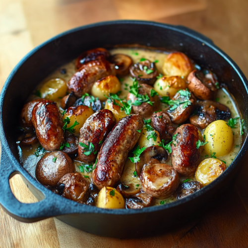 Saucisses, Champignons et Pommes de Terre au Four : Un Plat Savoureux et Réconfortant