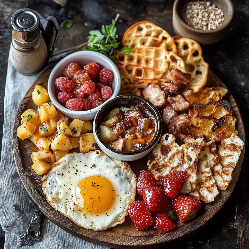 Le petit-déjeuner est souvent décrit comme le repas le plus important de la journée. Cependant, il n’est pas toujours facile de varier ce repas quotidien tout en maintenant un équilibre entre plaisir et nutrition. Aujourd’hui, je vous présente une recette de “Plats de Petit Déjeuner Ultime”, une combinaison savoureuse de textures et de saveurs qui comblera tous vos désirs matinaux. Ce petit-déjeuner complet comprend des œufs fromagés crémeux, du bacon croustillant, des pommes de terre dorées aux oignons et des gaufres moelleuses et croustillantes. Ce plat est idéal pour un brunch du weekend, lorsque vous avez le temps de savourer un repas copieux et fait maison.