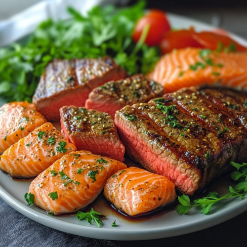 3. Ajoutez un côté de légumes grillés : Pour équilibrer le plat, vous pouvez accompagner ce surf et turf de légumes grillés, comme des asperges, des poivrons, ou des courgettes, assaisonnés avec un peu d’huile d’olive, du sel, et du poivre. Cela ajoutera une touche de fraîcheur tout en apportant plus de nutriments à votre repas.