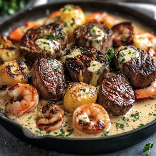La poêlée de steak et fruits de mer à la crème à l’ail et parmesan est un plat réconfortant et gourmet qui associe l’élégance du steak tendre et des crevettes juteuses avec la richesse d’une sauce crémeuse au parmesan et à l’ail. Ce plat est idéal pour un dîner en amoureux, une occasion spéciale ou simplement pour un repas indulgent à la maison. La combinaison de saveurs de viande et de fruits de mer, de crème et de parmesan, offre une expérience culinaire mémorable.