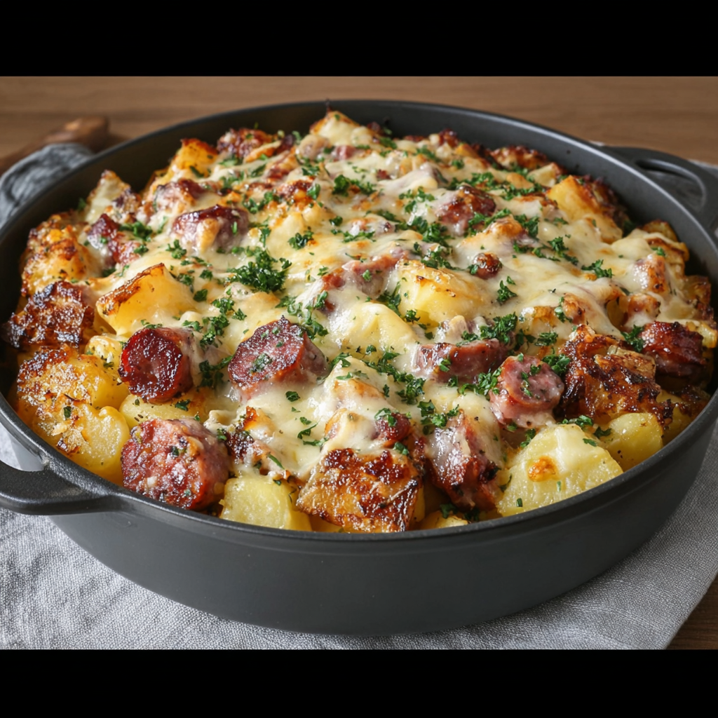 La poêlée franc-comtoise au Comté et saucisse de Montbéliard est une recette généreuse et authentique qui ravira tous les amateurs de cuisine traditionnelle. Entre le fondant des pommes de terre, le goût fumé des saucisses et le crémeux du fromage, chaque bouchée est un véritable plaisir.