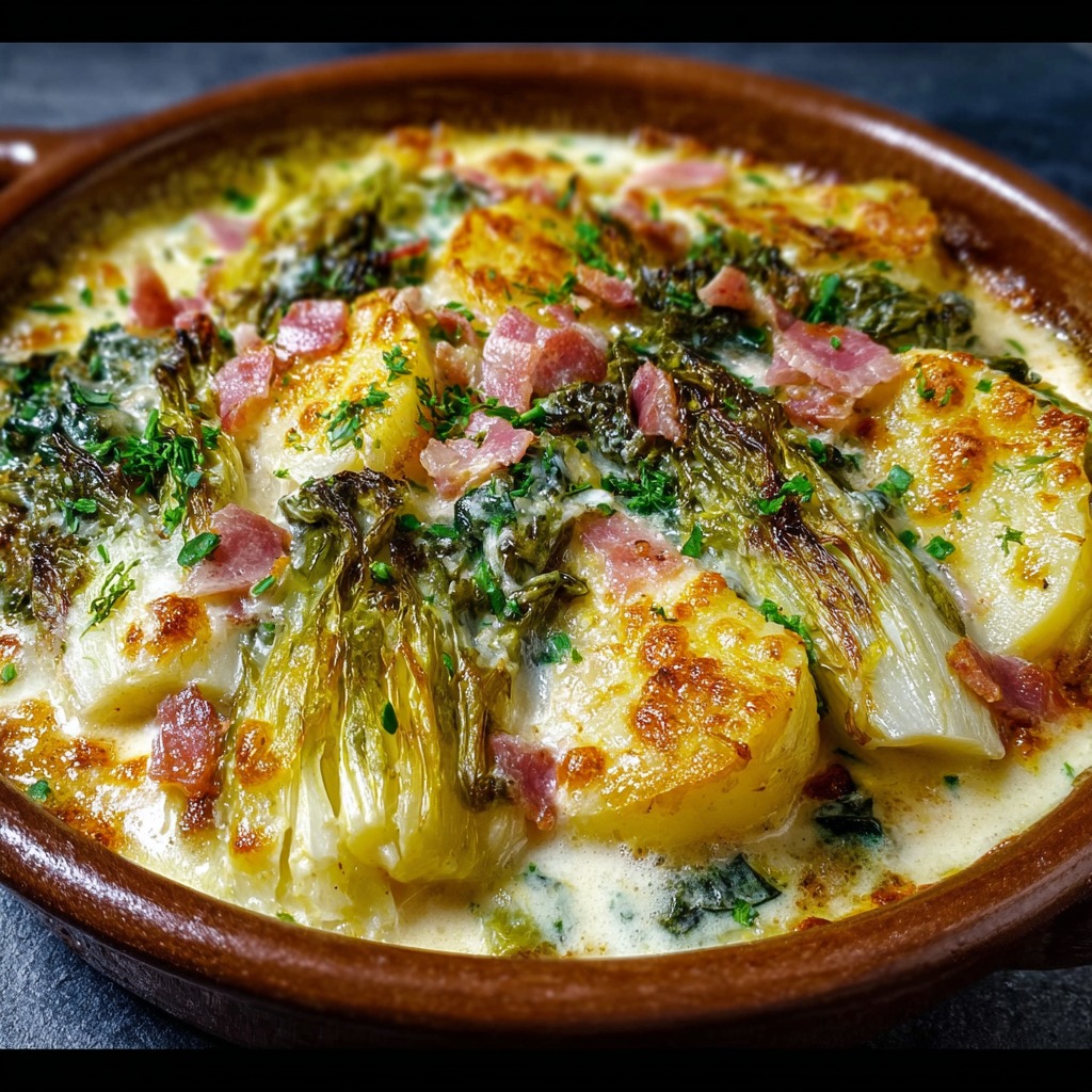 Les endives sont nettoyées et coupées en tronçons. Les pommes de terre sont pelées et découpées en dés réguliers. Les oignons sont émincés, et l’ail est écrasé. Le persil est haché pour la finition. Cette préparation permet un assemblage rapide et une cuisson uniforme.