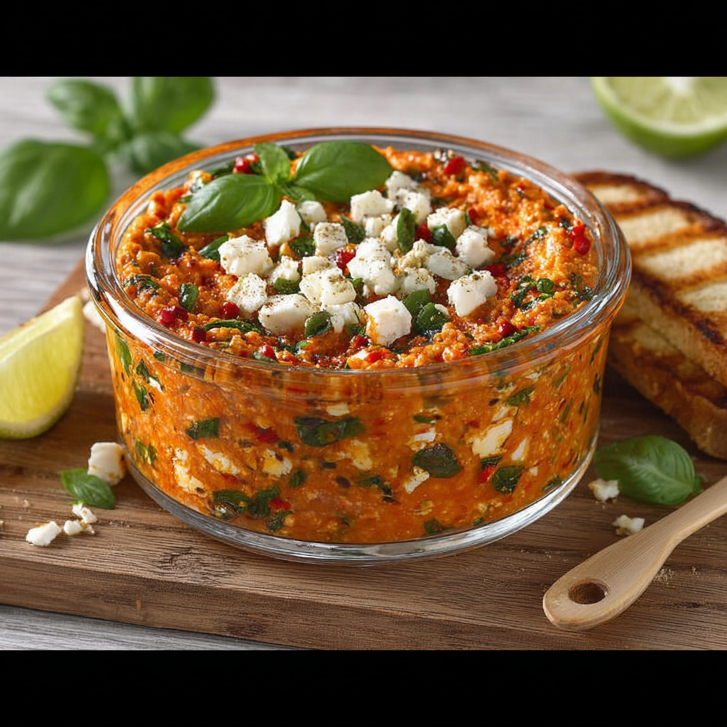 Grâce à l’association du poivron rôti, de la feta fondante, du basilic frais et du citron vert, cette tartinade devient vite un incontournable de la cuisine maison.