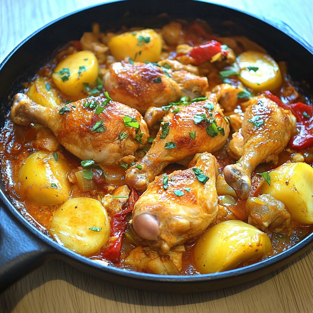 Le Pollo a la Portuguesa, ou poulet à la portugaise, est une recette traditionnelle mijotée qui évoque la chaleur des tablées familiales, les parfums d’huile d’olive, de vin blanc sec, de poivrons colorés et de tomates juteuses. C’est un plat généreux, confortant et hautement convivial, qui combine tout ce que l’on aime dans la cuisine méditerranéenne.